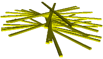 Somit entsteht in der Realität eine recht labile Konstruktion. Das endgültige Aussehen der Stapelung wird durch verschiedene Faktoren wie Farbe, Maße und Anzahl der Latten oder den jeweiligen Drehwinkel bestimmt. Bei einer virtuellen Stapelung können außerdem Faktoren berücksichtigt werden, die in der Realität nicht möglich sind. So können die Auflagepunkte mit einem durch Zufall ermittelten Wert vom Mittelpunkt verschoben werden oder die Latten schweben in einem festen oder zufälligen Abstand übereinander. Die spiralen Stapelungen wurden in der 3D - Sprache VRML (s. unten) realisiert. Im Folgenden können Sie nun: oder Eigene Stapelungen erstellen | ||